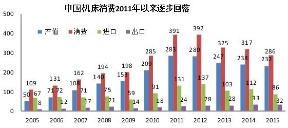 從2002年開始中國(guó)機(jī)床消費(fèi)額上升,成為世界機(jī)床第一消費(fèi)大國(guó)。2015年中國(guó)機(jī)床市場(chǎng)消費(fèi)額286億美元,同比下降10%。消費(fèi)情況如下表所示:(單位:億美元)