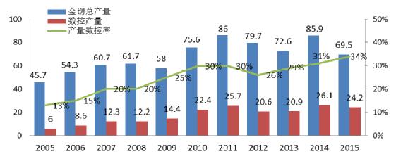 近年來中國(guó)機(jī)床市場(chǎng)需求結(jié)構(gòu)加快了變化的速度,普通、低檔數(shù)控機(jī)床需求大幅度萎縮,大重型和高檔數(shù)控機(jī)床仍保持穩(wěn)定需求。2015年金切機(jī)床的產(chǎn)量69.5萬臺(tái)、同比下降19%,數(shù)控金切機(jī)床產(chǎn)量24.2萬臺(tái)、同比下降7%,產(chǎn)量數(shù)控化率逐年提升,保持增長(zhǎng)態(tài)勢(shì);2005-2015年金切機(jī)床產(chǎn)量如下圖,(單位:萬臺(tái))