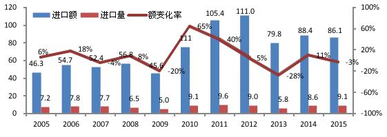 雖然中國(guó)機(jī)床需求總量在逐年萎縮,2015年金切機(jī)床進(jìn)口額86.1億美元、同比微降2.6%,進(jìn)口量9.1萬臺(tái)、同比增長(zhǎng)6%。目前我國(guó)每年消費(fèi)的中高檔數(shù)控機(jī)床的數(shù)量在5-6萬套左右,金額在60億元左右,其中進(jìn)口量占到總量的85%左右。未來我國(guó)數(shù)控機(jī)床行業(yè)具有很好的發(fā)展?jié)摿?、進(jìn)口替代的空間較大。金切機(jī)床進(jìn)口保持高位增長(zhǎng)態(tài)勢(shì),具體見下表,(單位:億美元/萬臺(tái))。